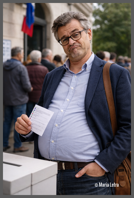 Ele não receia o dia das votações, para a eleição, seja do que ou de quem fôr. De ventre para fora e peito para dentro… votará à esquerda ou à direita ou até ao centro.